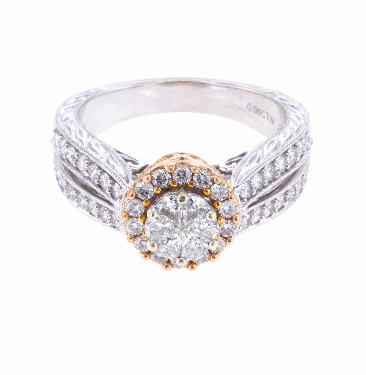 14 KT. WHITE AND ROSE GOLD CLUSTER INVISIBLE SET RING WITH 0.96CT TOTAL WEIGHT