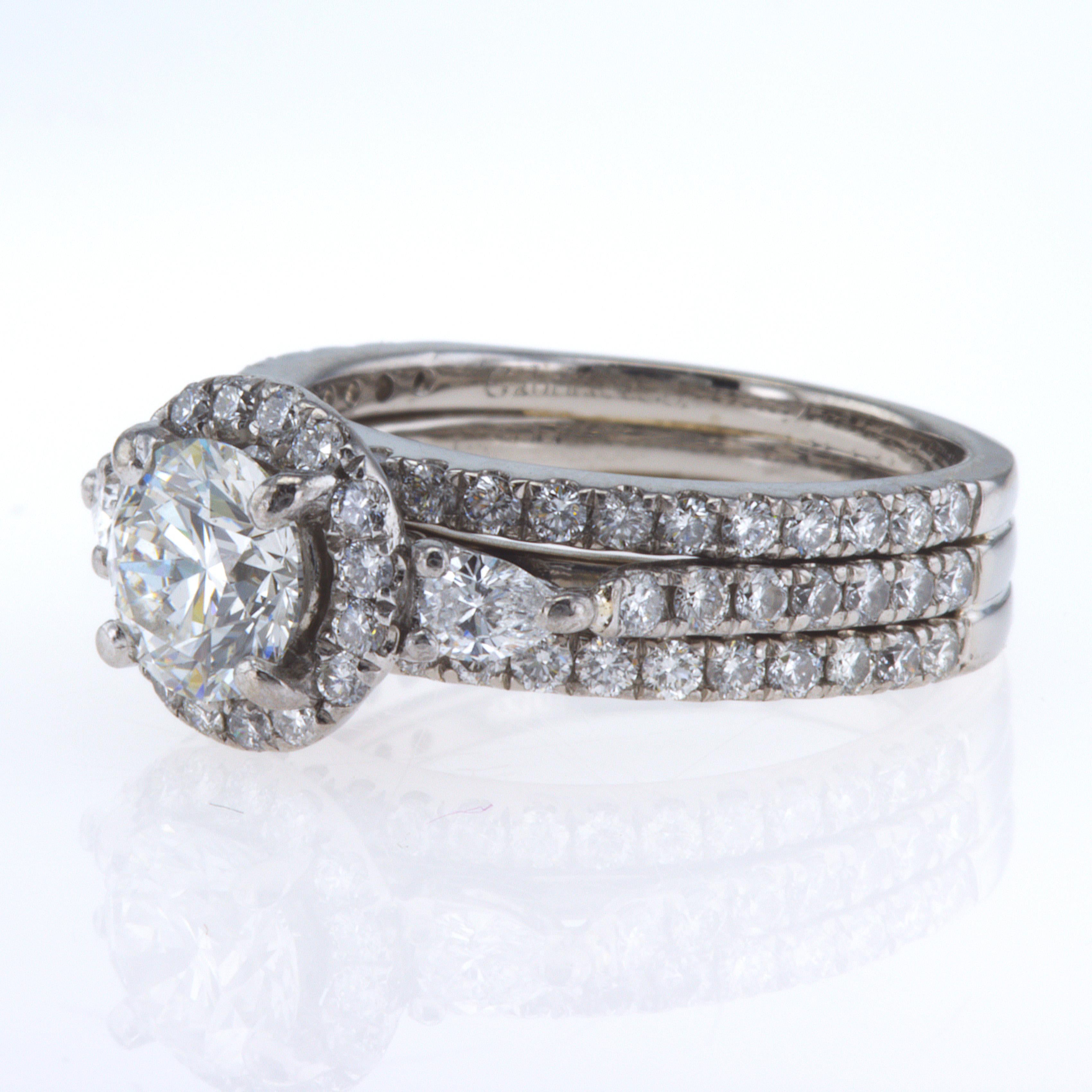 PALLADIUM RING SET WITH ONE 0.90CT G-SI1 IDEAL-CUT DIAMOND. THE RING IS ALSO SET WITH 2=0.20CT PEAR DIAMONDS AND 0.36CT ROUND DIAMONDS.