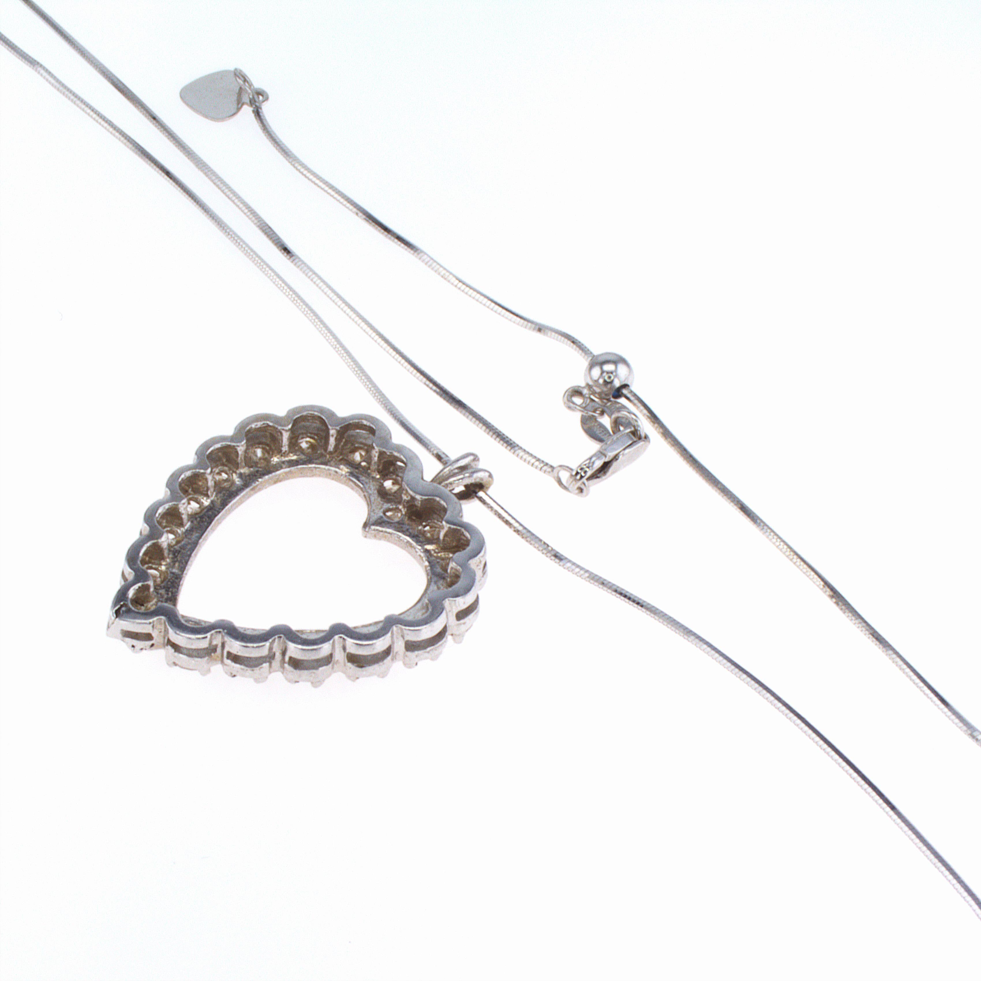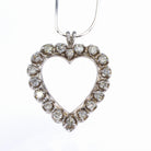 This consignment necklace from The Gem Lab features a heart pendant crafted from 14KT white gold. Round-cut diamonds, totaling 1.00 carat in weight, are meticulously set within the pendant. The diamonds exhibit I color and I-1 clarity or higher, matched for size, color and brilliance. An adjustable 22-inch chain, complete with a secure lobster claw clasp, accompanies the pendant. This pre-owned piece offers a touch of timeless elegance.