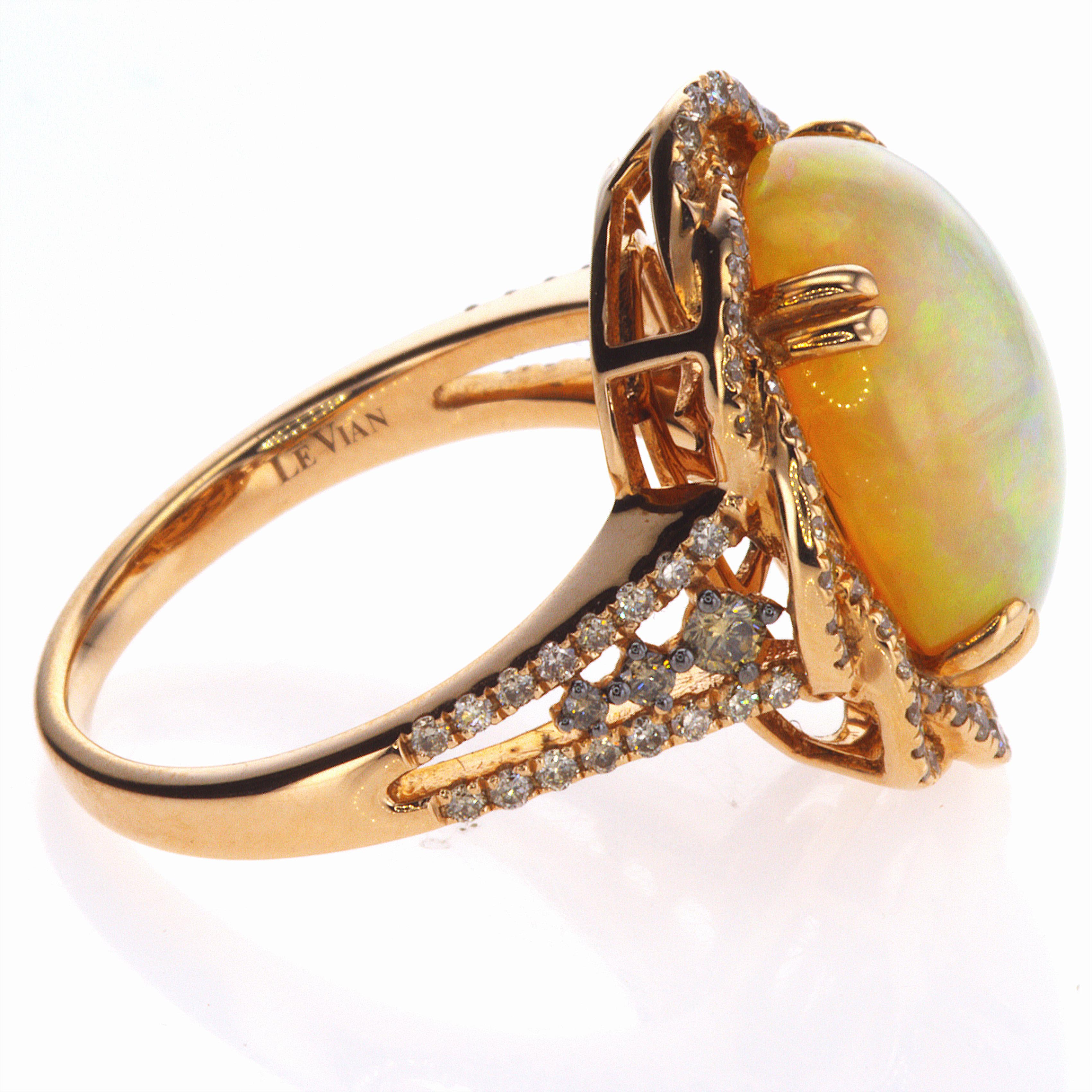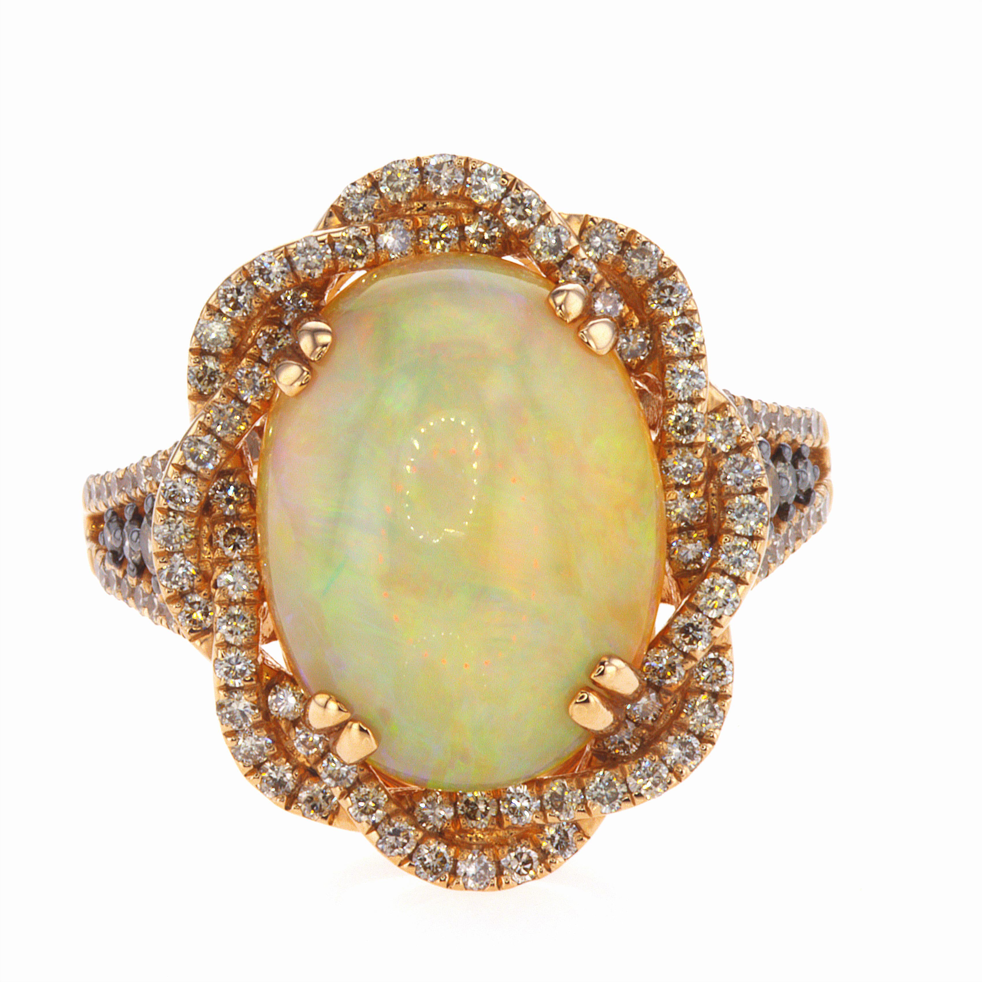 Unleash unparalleled elegance with this breathtaking Opal and Diamond ring from Le Vian. This ring elevates sophistication by showcasing a mesmerizing 4-1/2 ct. Neopolitan Opal embraced by a braided halo of delicate nude (off-white) diamonds.