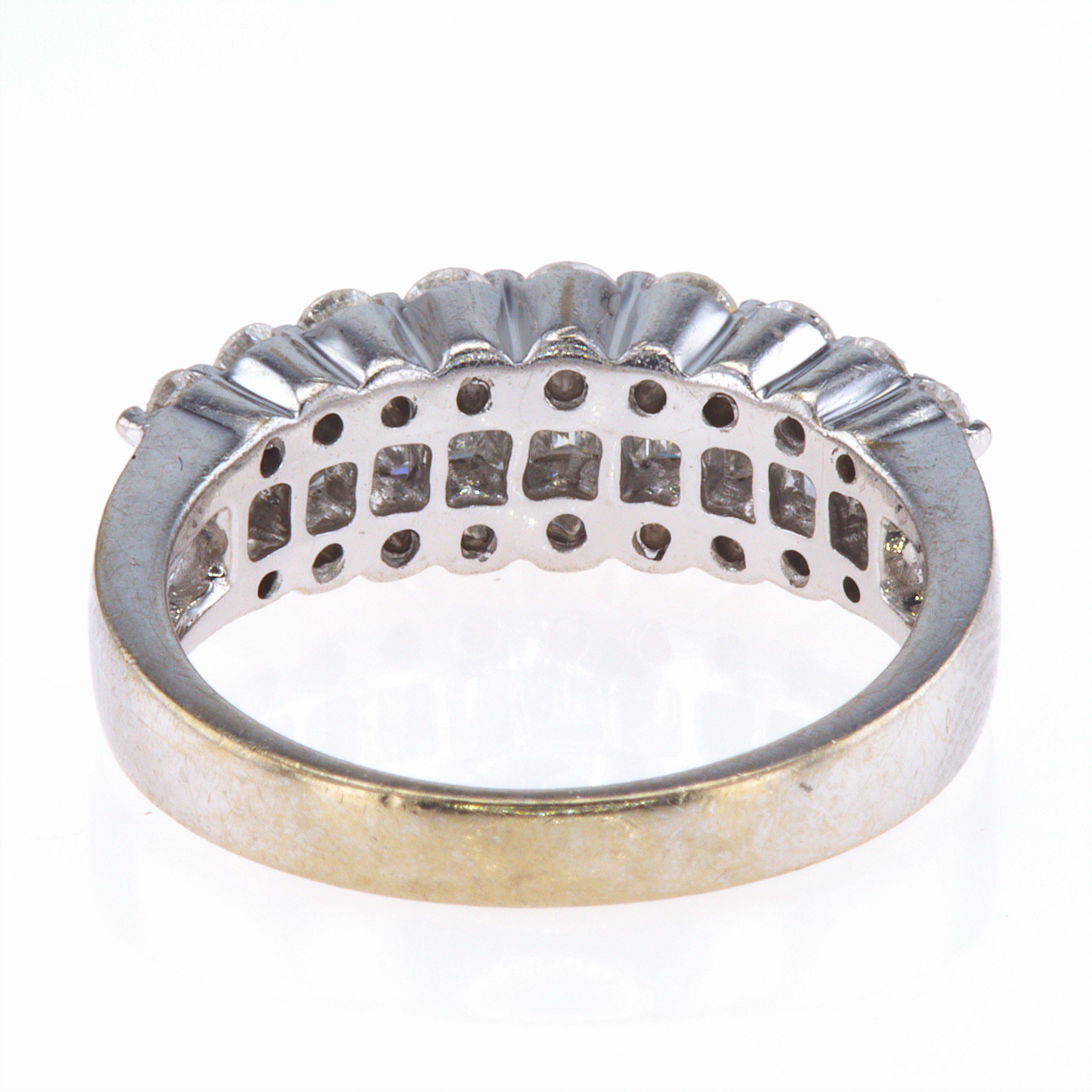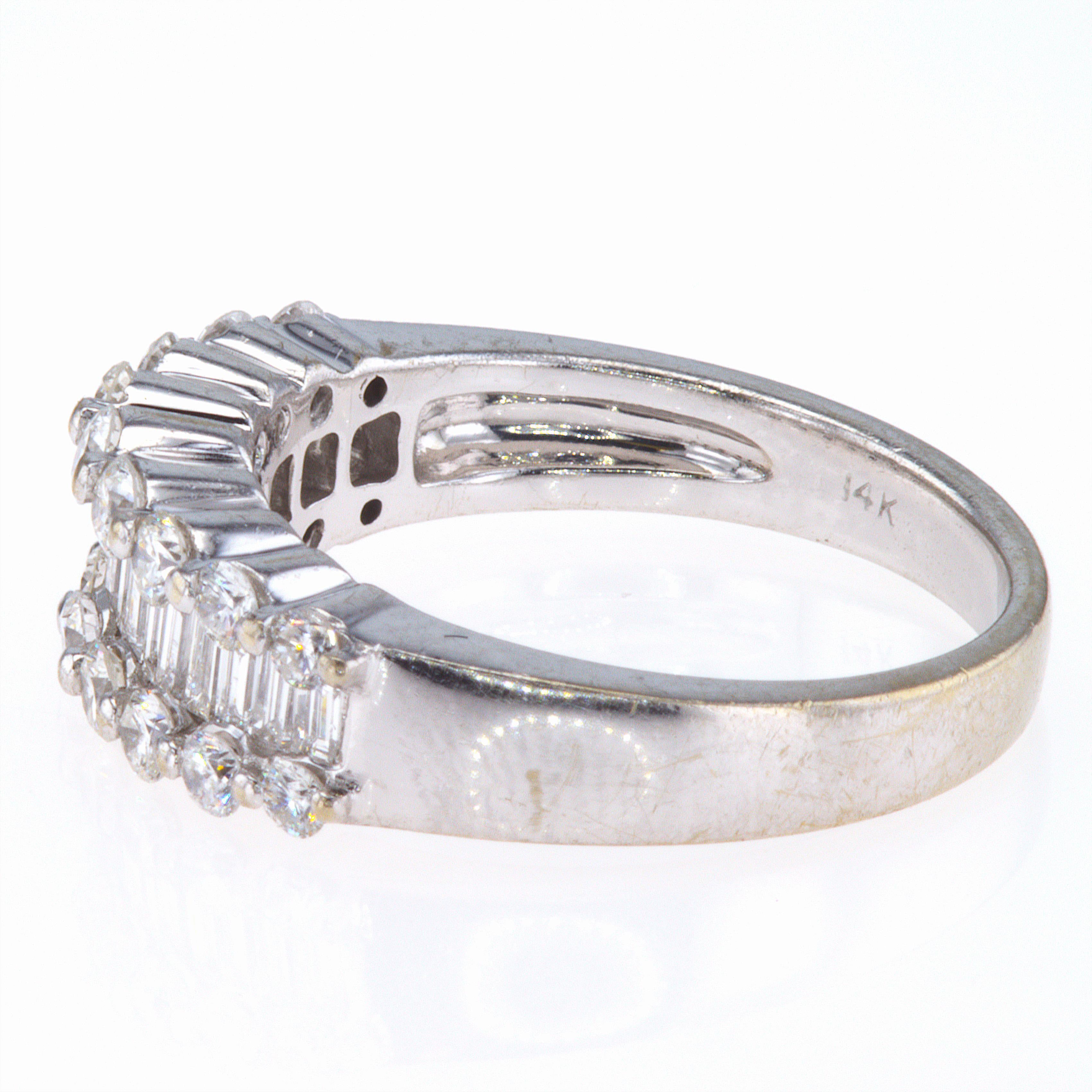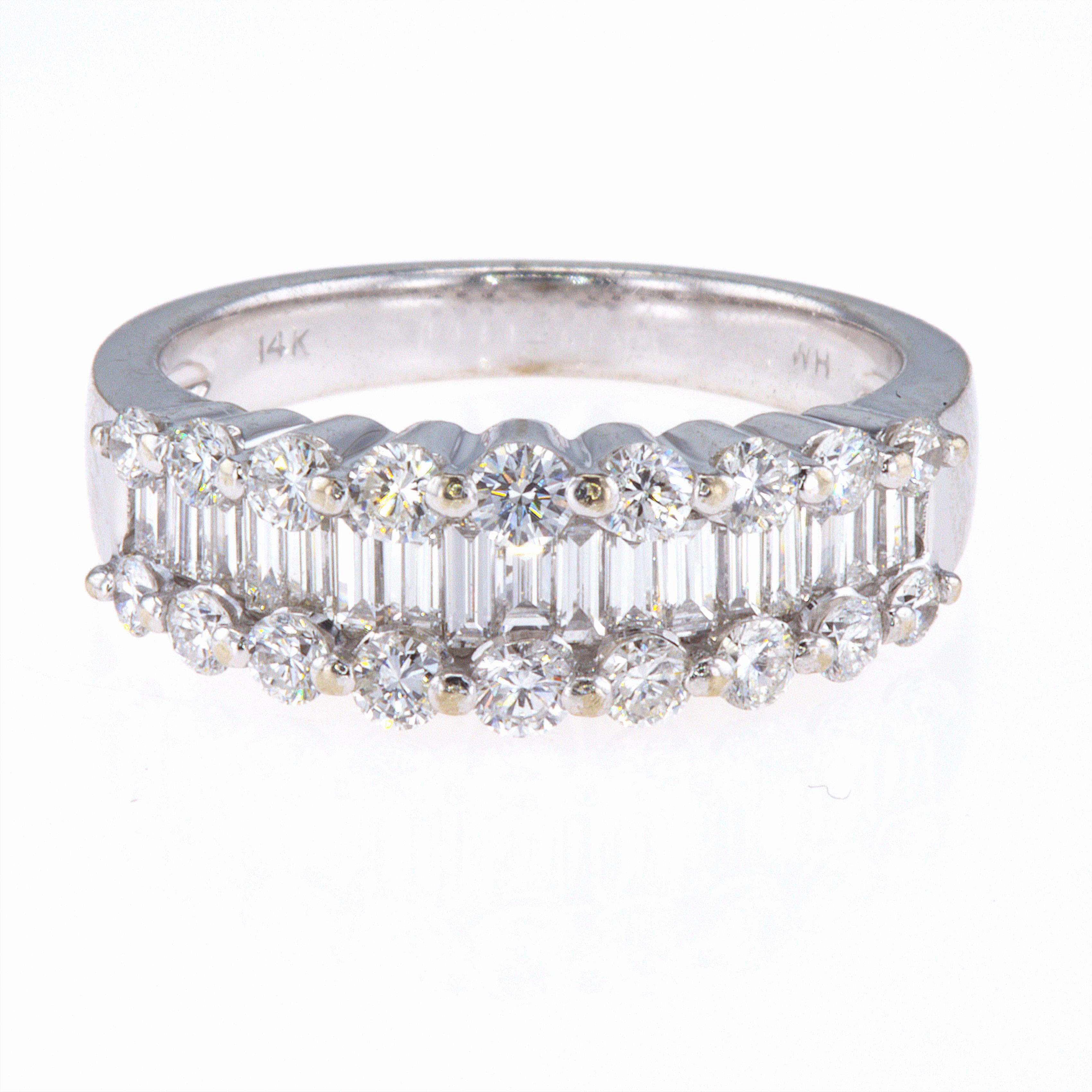 Approximately 18 round diamonds, totaling 0.70ct, dance alongside 17 baguette diamonds, totaling 0.60ct. Each diamond boasts G-color and SI-1 clarity or higher, meticulously matched for unmatched sparkle and fire. The ring, a size 6.5, is accompanied by a 14KT WG diamond band app 1.30CT TW
