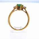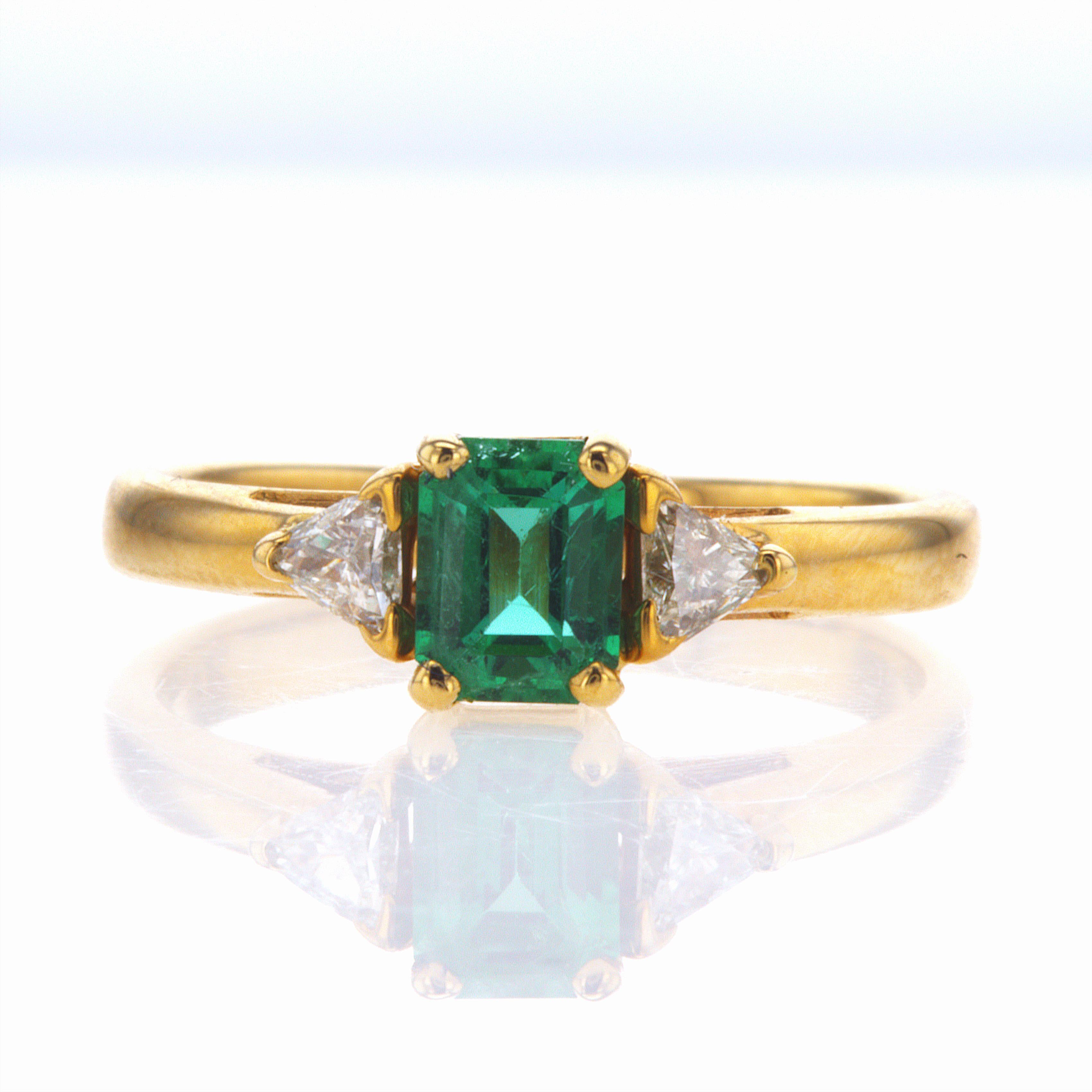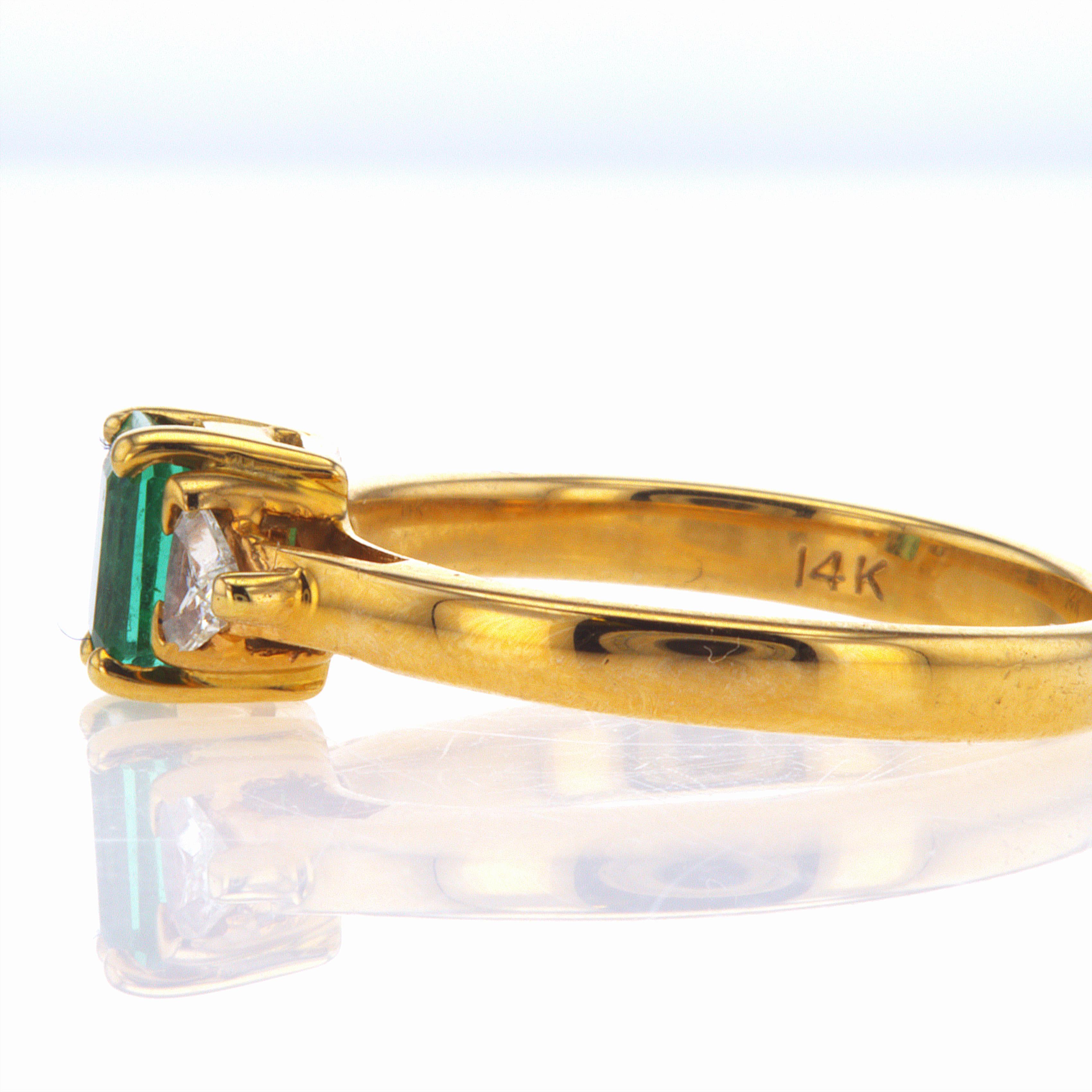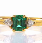 Framed by two perfectly matched trillion-cut diamonds, each boasting G-color and SI-1 clarity or higher, this 14kt yellow gold ring is a symphony of color and light. The diamonds, totaling 0.10ct, add brilliance and sparkle to the emerald's rich tones.