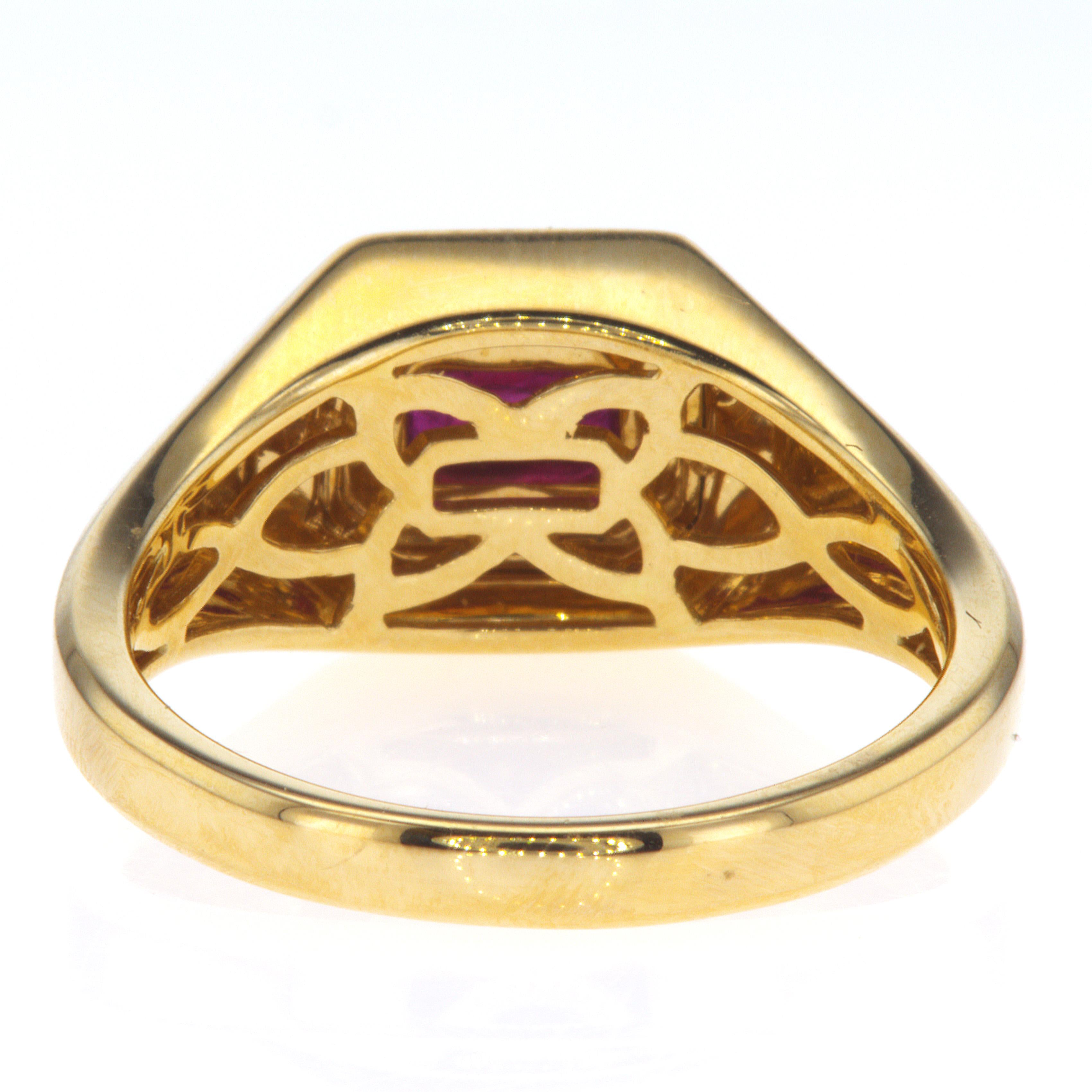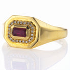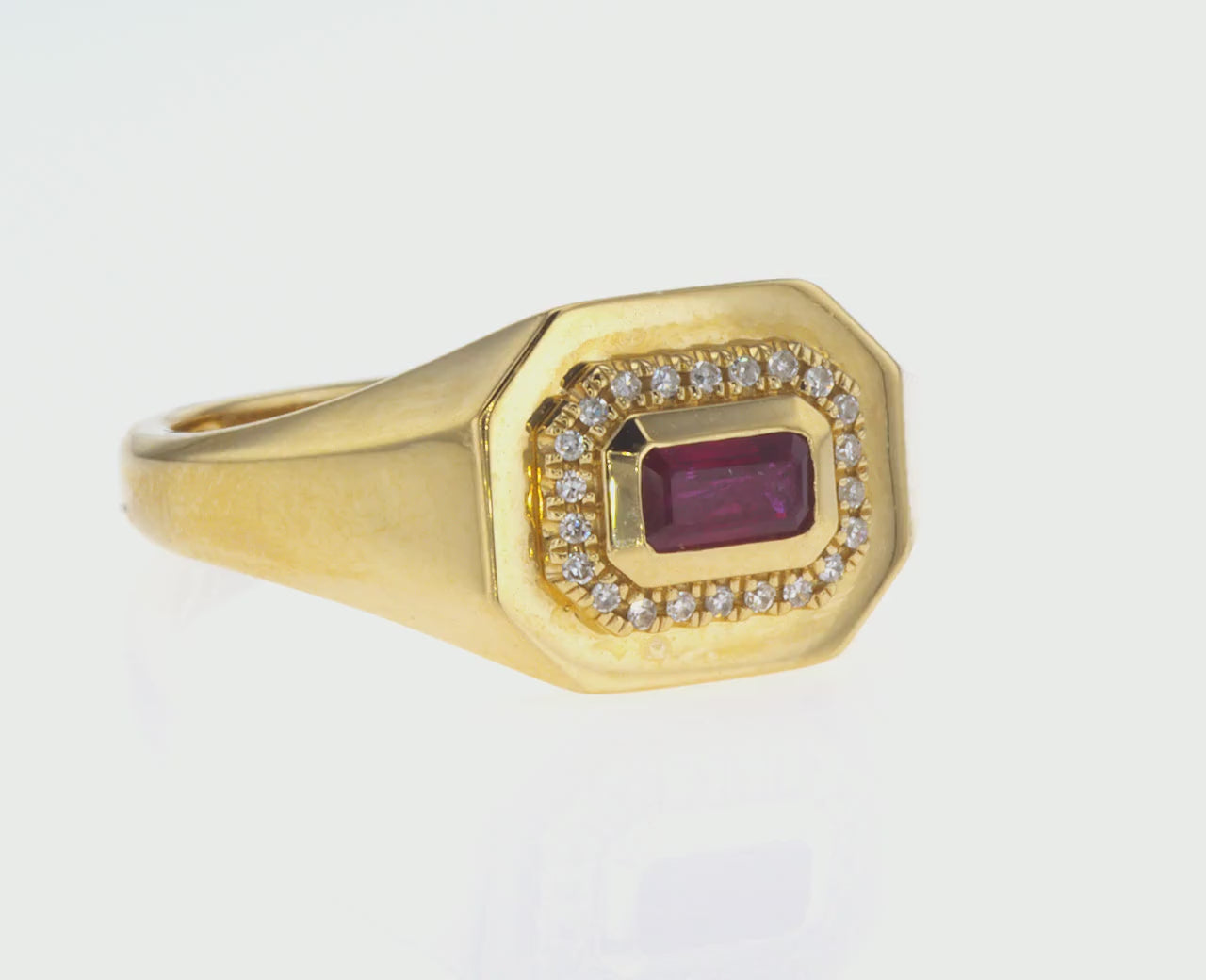 Set in radiant 14KT yellow gold, an east-west emerald cut ruby blazes at the heart of this piece. A scintillating halo of diamonds (.08cts TW) dances around the ruby, enhancing its fiery brilliance.