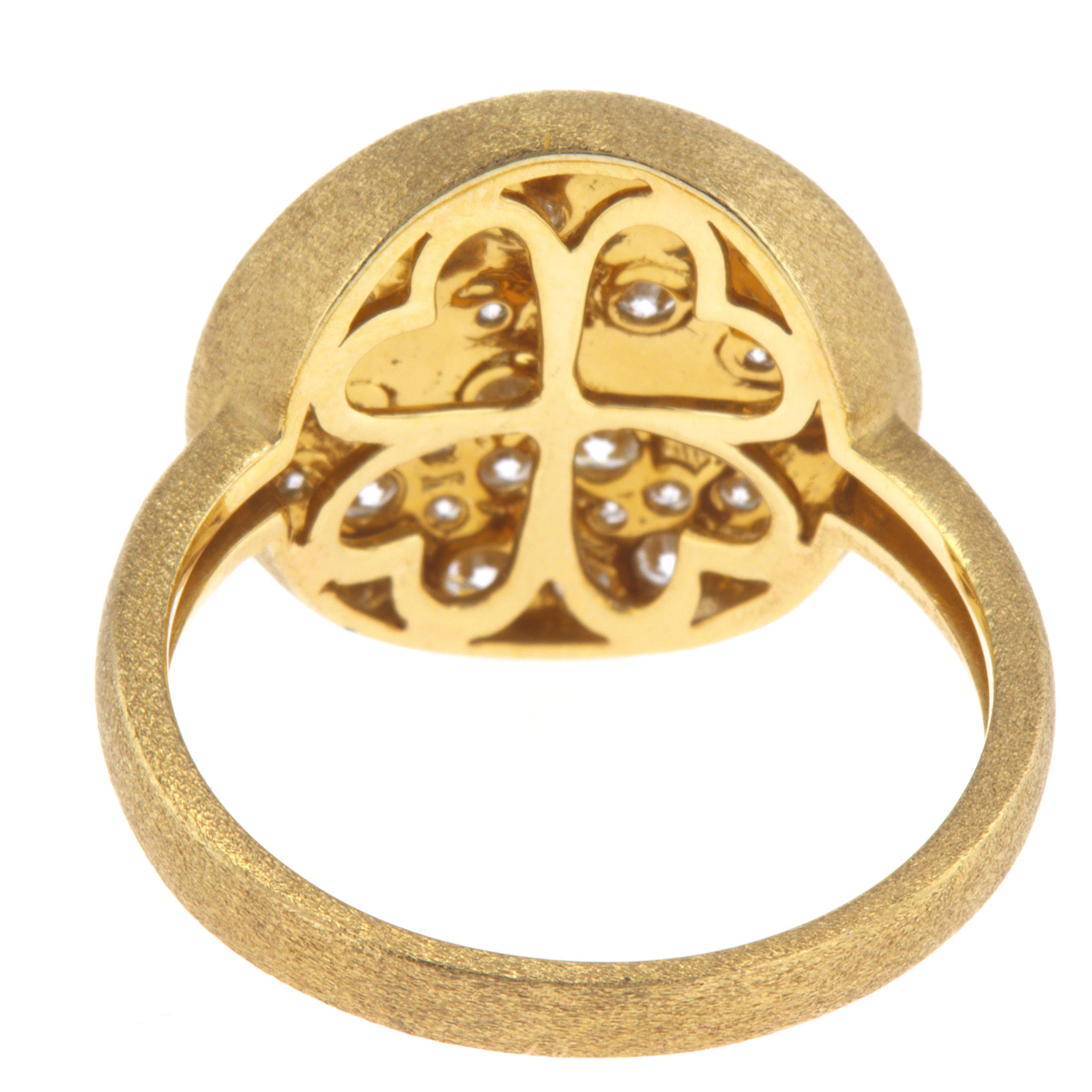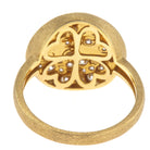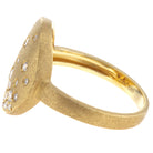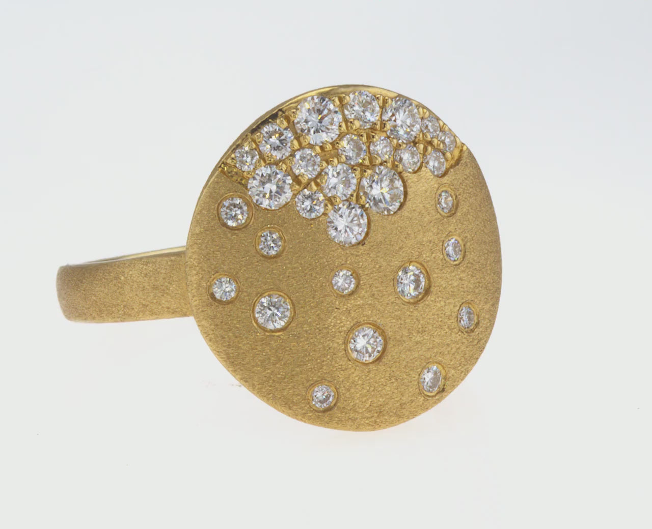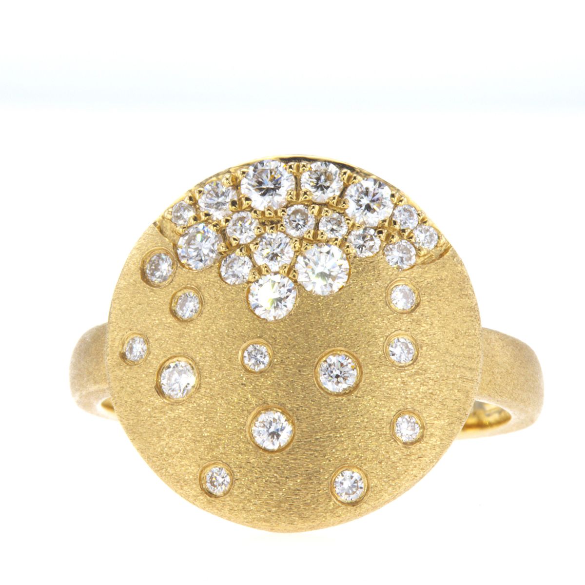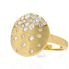 Crafted in lustrous 14KT yellow gold, this ring features a unique round disc design with a chic satin finish. Like a celebratory shower, scattered diamonds totaling 0.49 carats TW are flush set, catching the light with every turn.