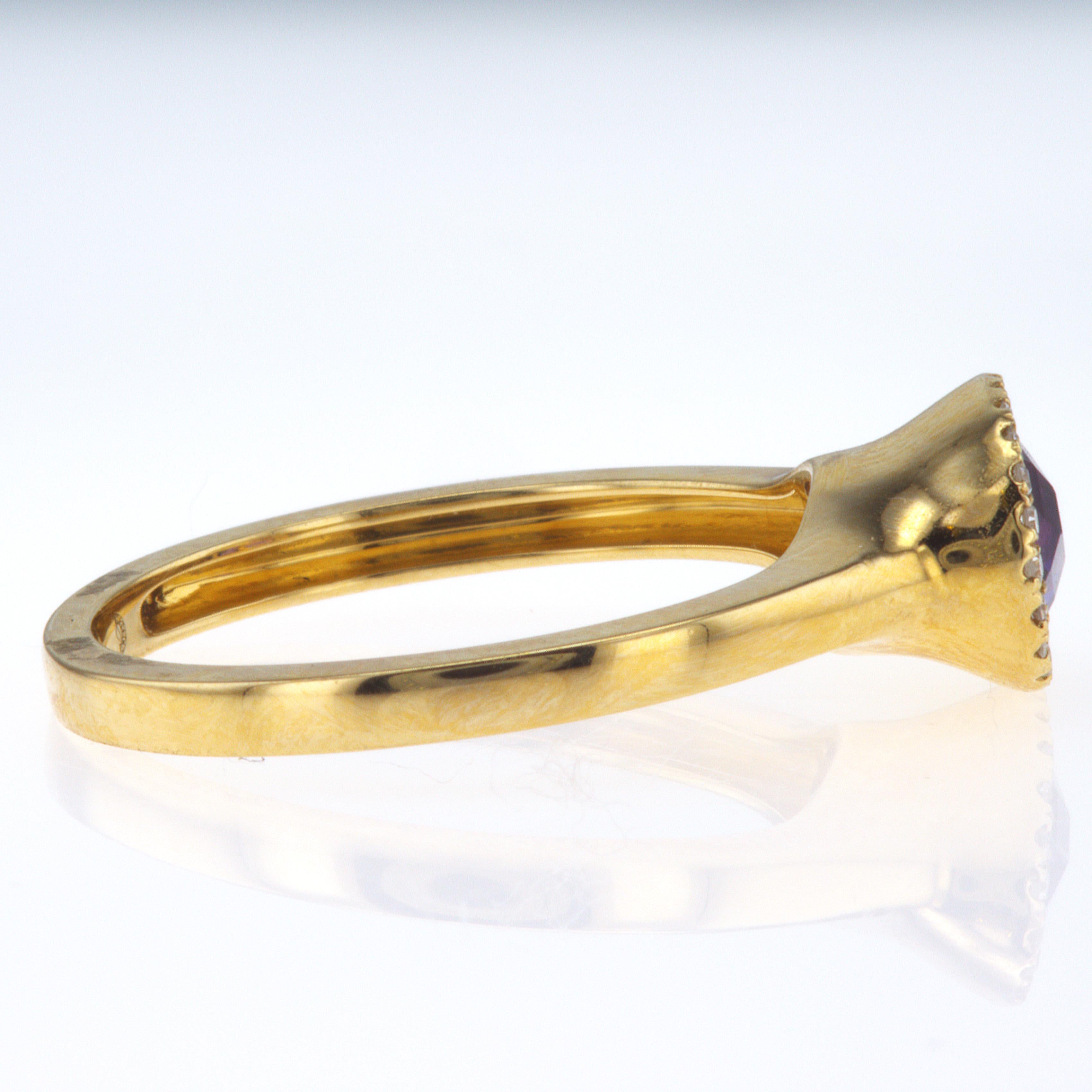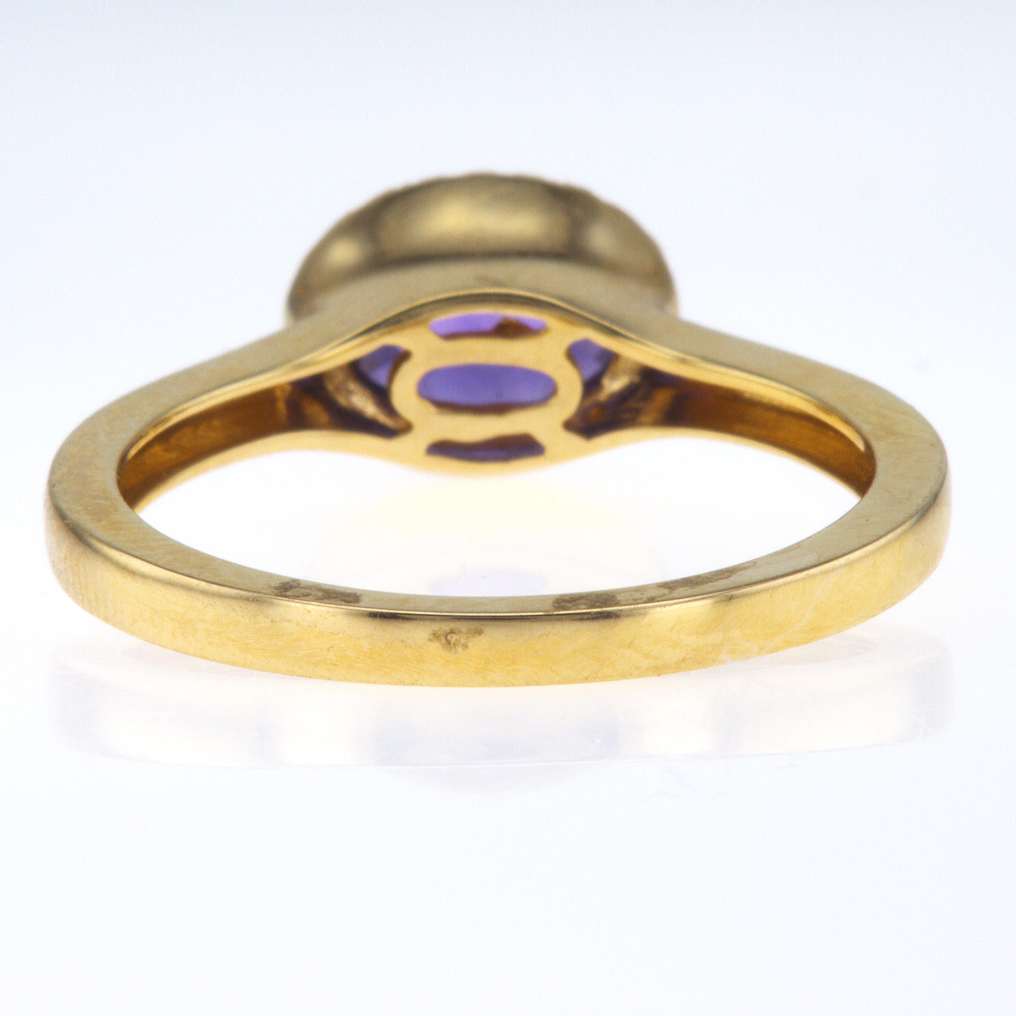 A sparkling halo of diamonds, totaling 0.09 carats, surrounds the amethyst, adding brilliance and an air of timeless elegance. Style AR10403AM-820Y is a captivating blend of modern design and classic sophistication.