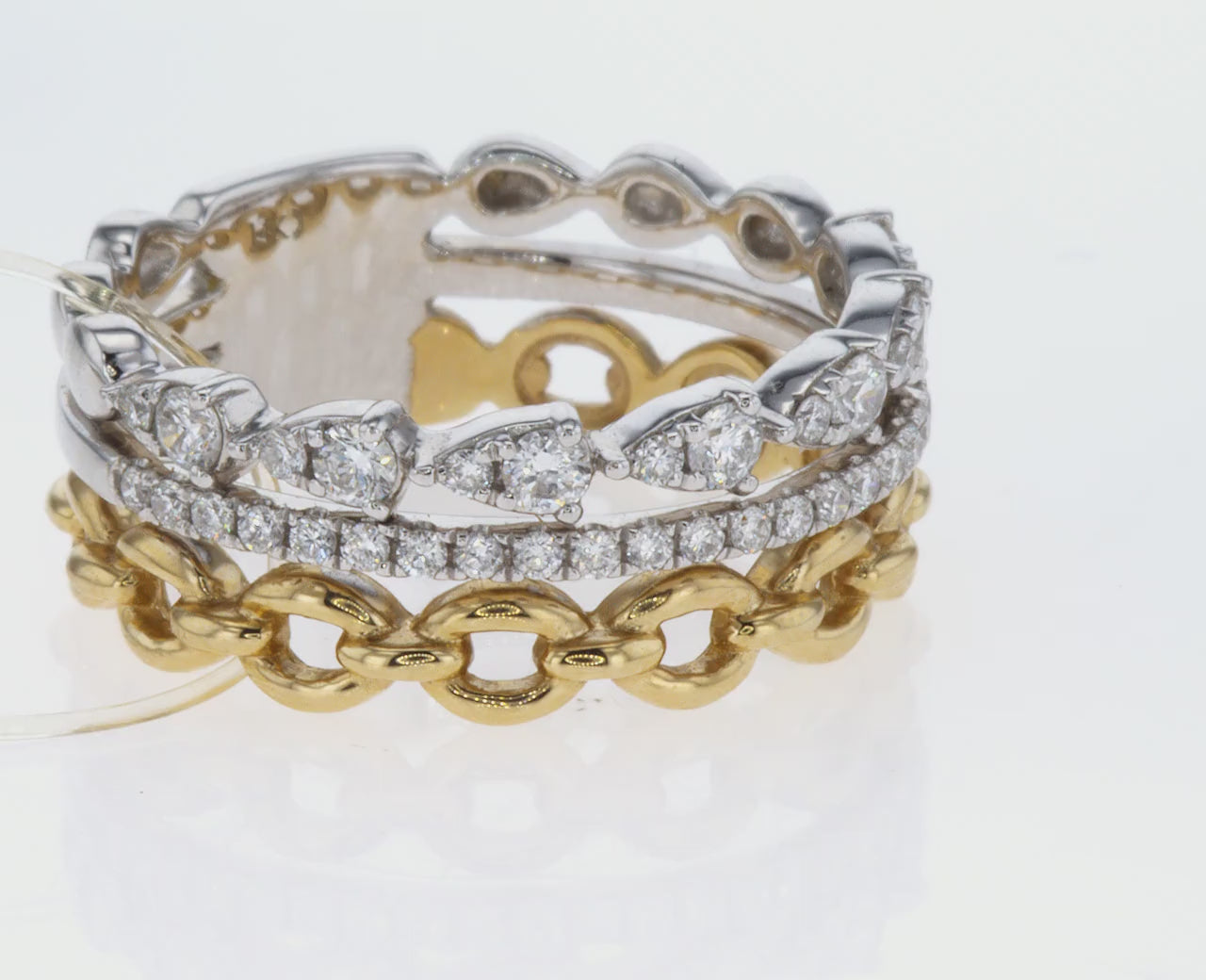 Refined and radiant, this three-row diamond link ring is the ultimate statement piece for those who crave unique and unforgettable style.