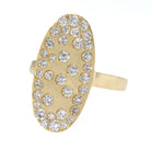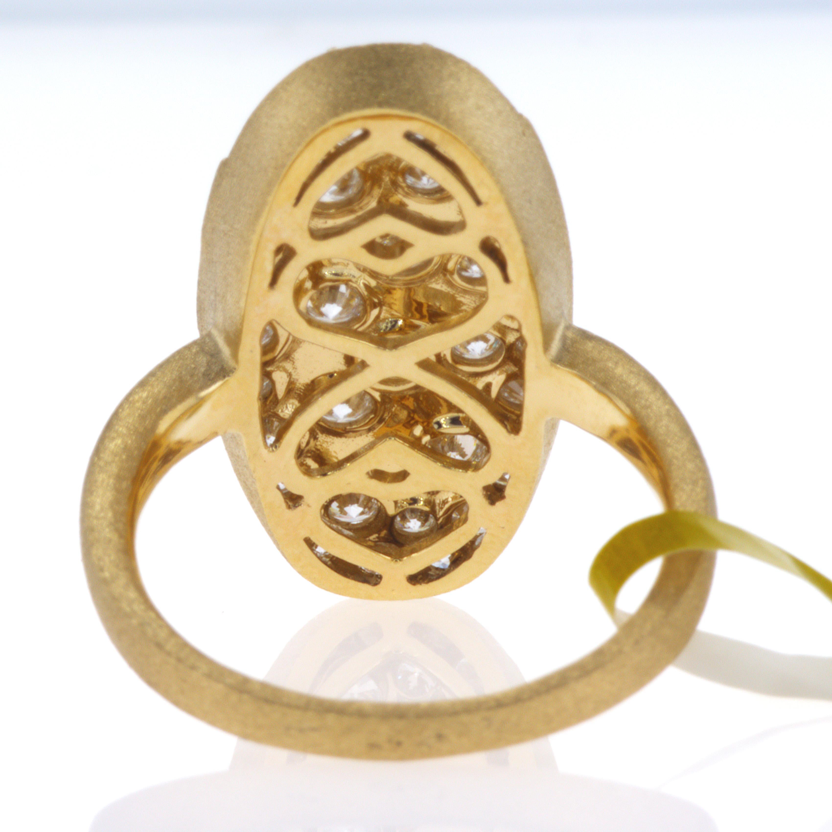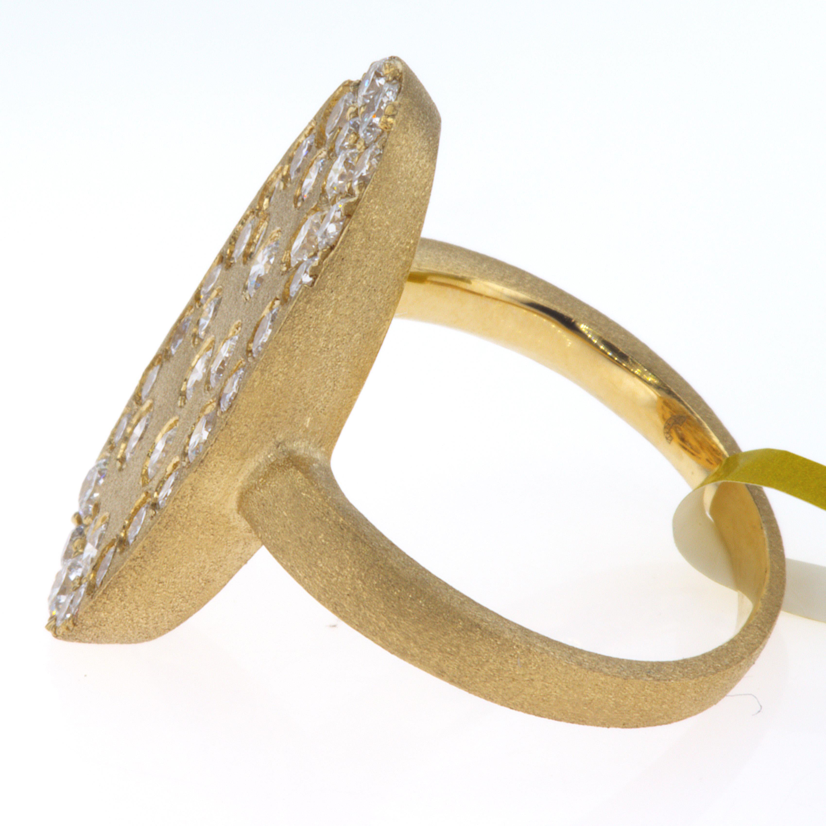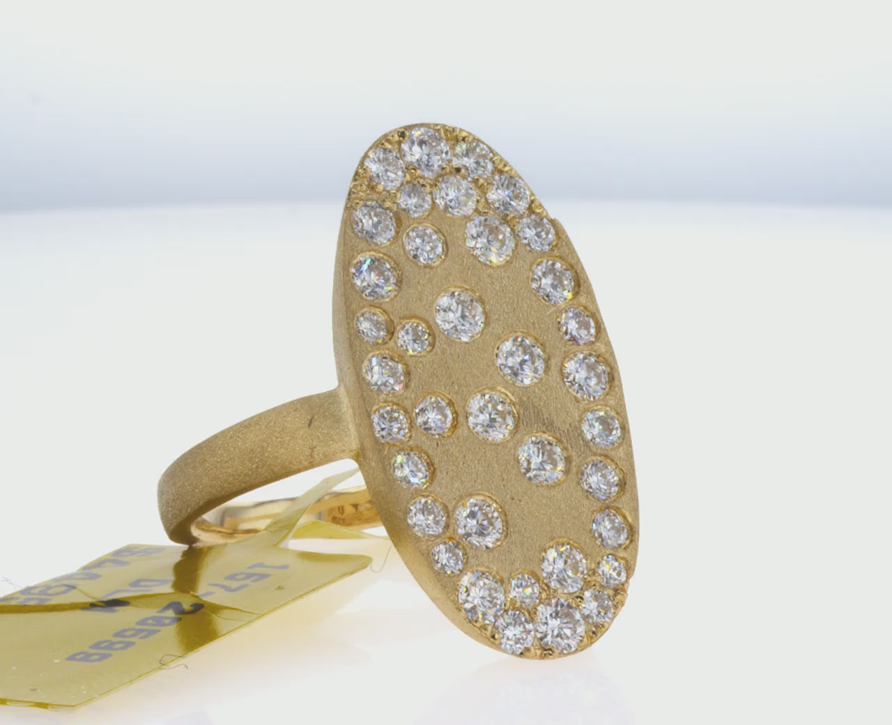 Crafted in luminous 14KT yellow gold, this ring features a captivating 24mm x 12mm oval silhouette with a luxurious satin finish. Scattered across the surface are shimmering diamonds, totaling 1.28 carats, creating a playful yet elegant "confetti" effect.