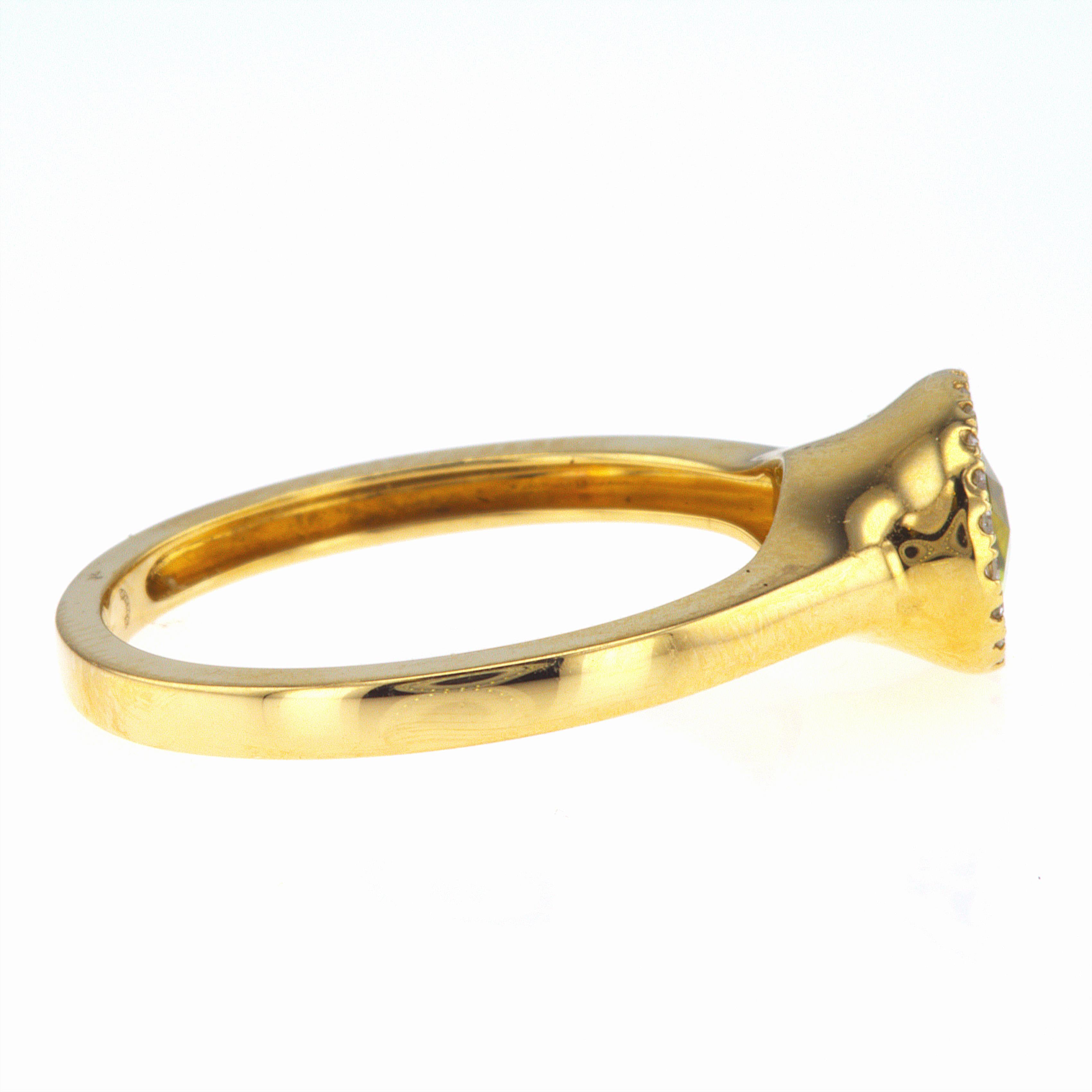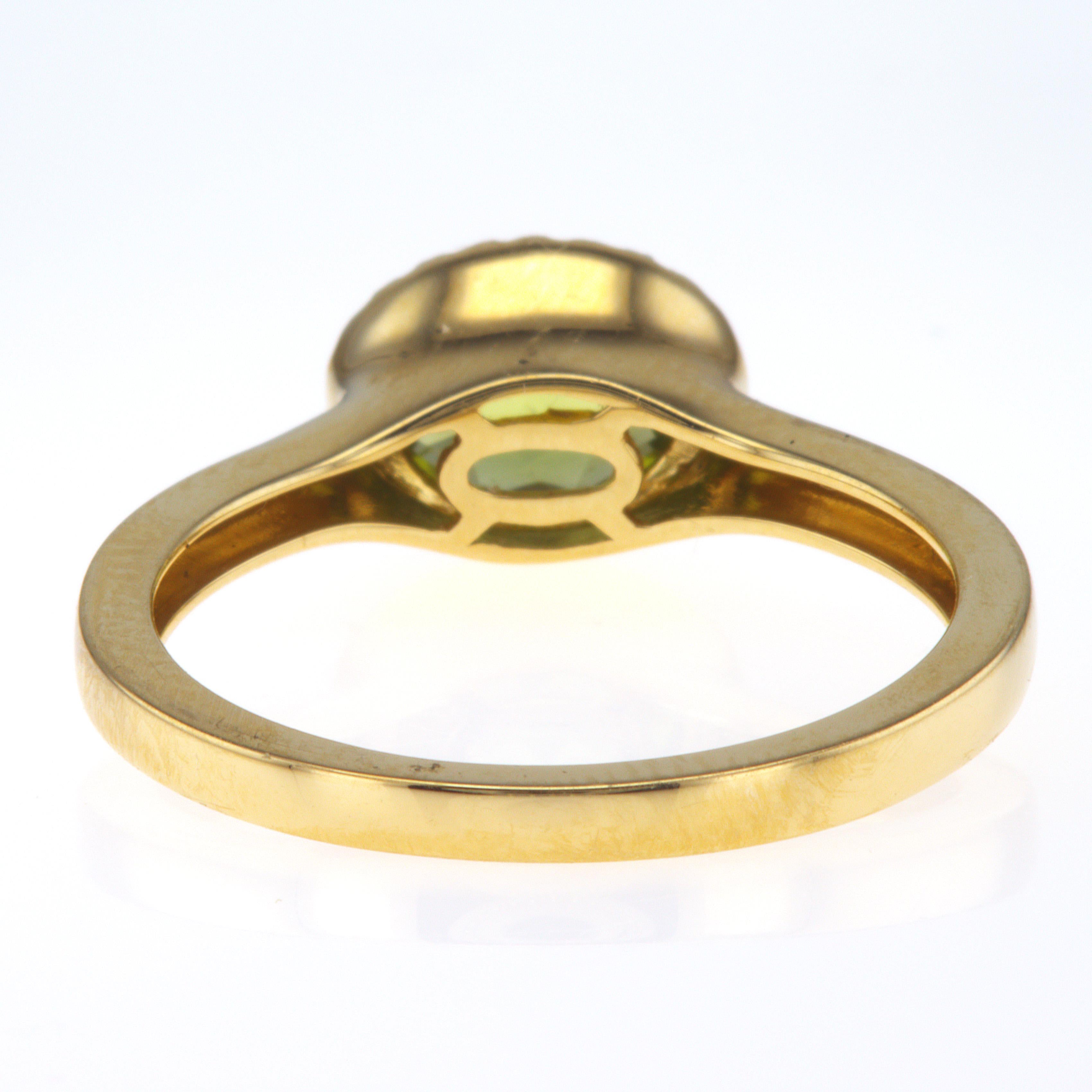 Sparkling around the peridot is a delicate halo of diamonds totaling 0.09 carats. Set in warm 14KT yellow gold, the diamond halo enhances the peridot's brilliance, creating a captivating dance of light.