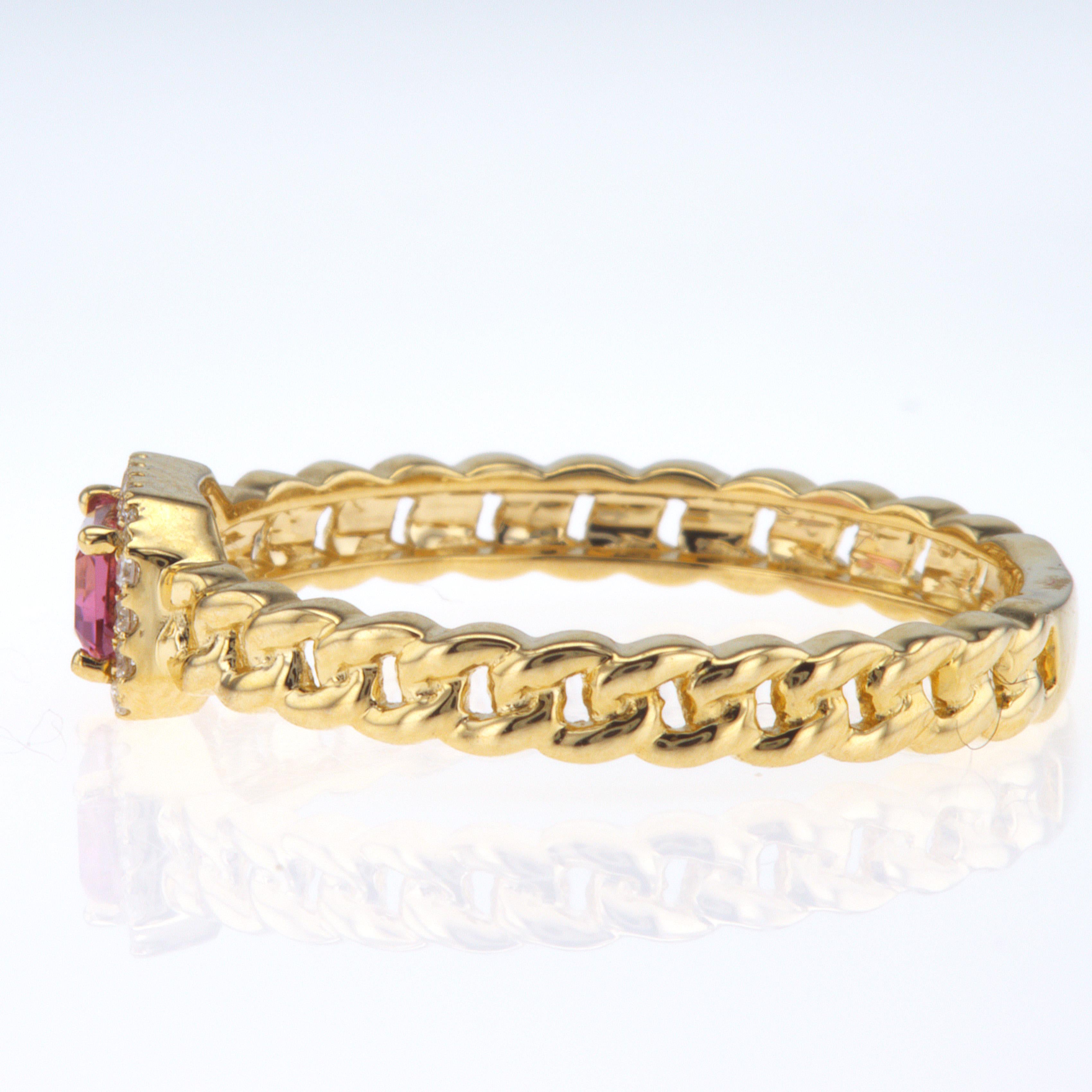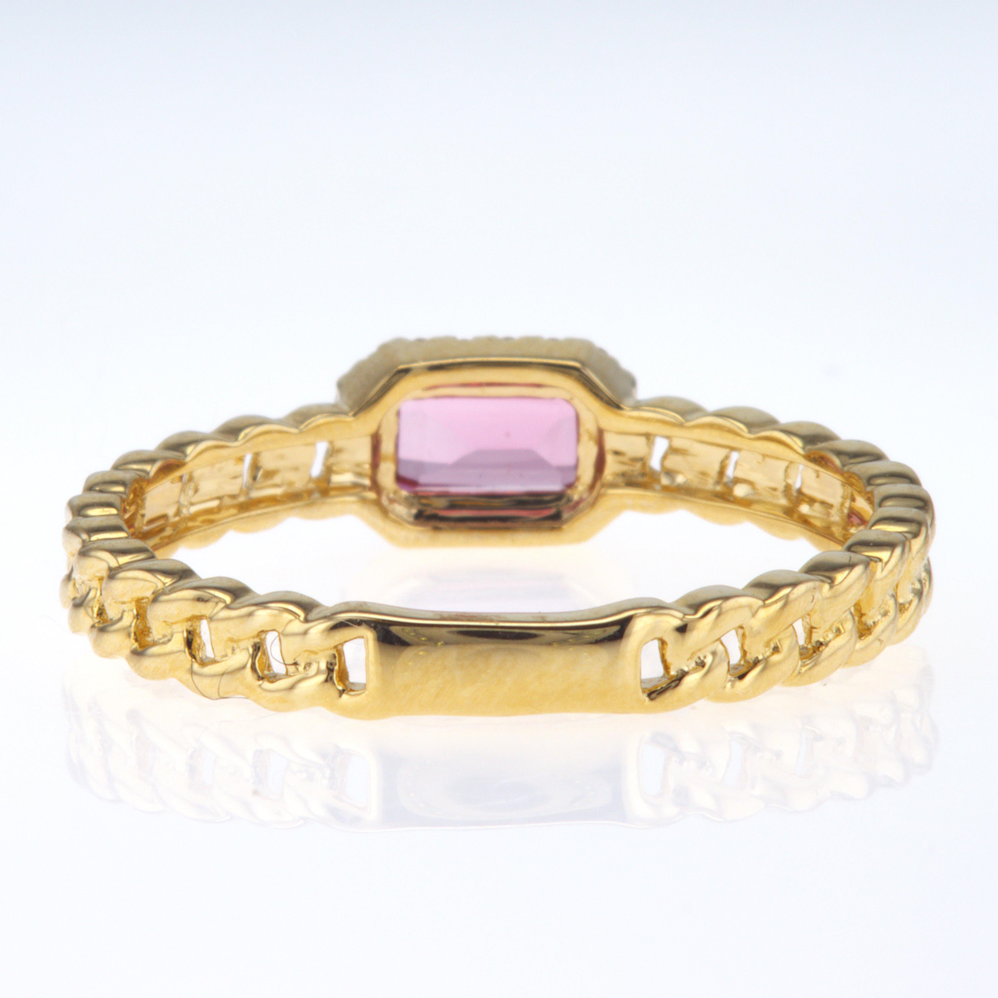 Crafted in gleaming 14kt yellow gold, the tourmaline is embraced by a dazzling diamond halo, 0.04cts TW, which adds a touch of brilliance to the alluring design. The unique chain-link shank makes this ring a chic statement piece that is ready to turn heads.