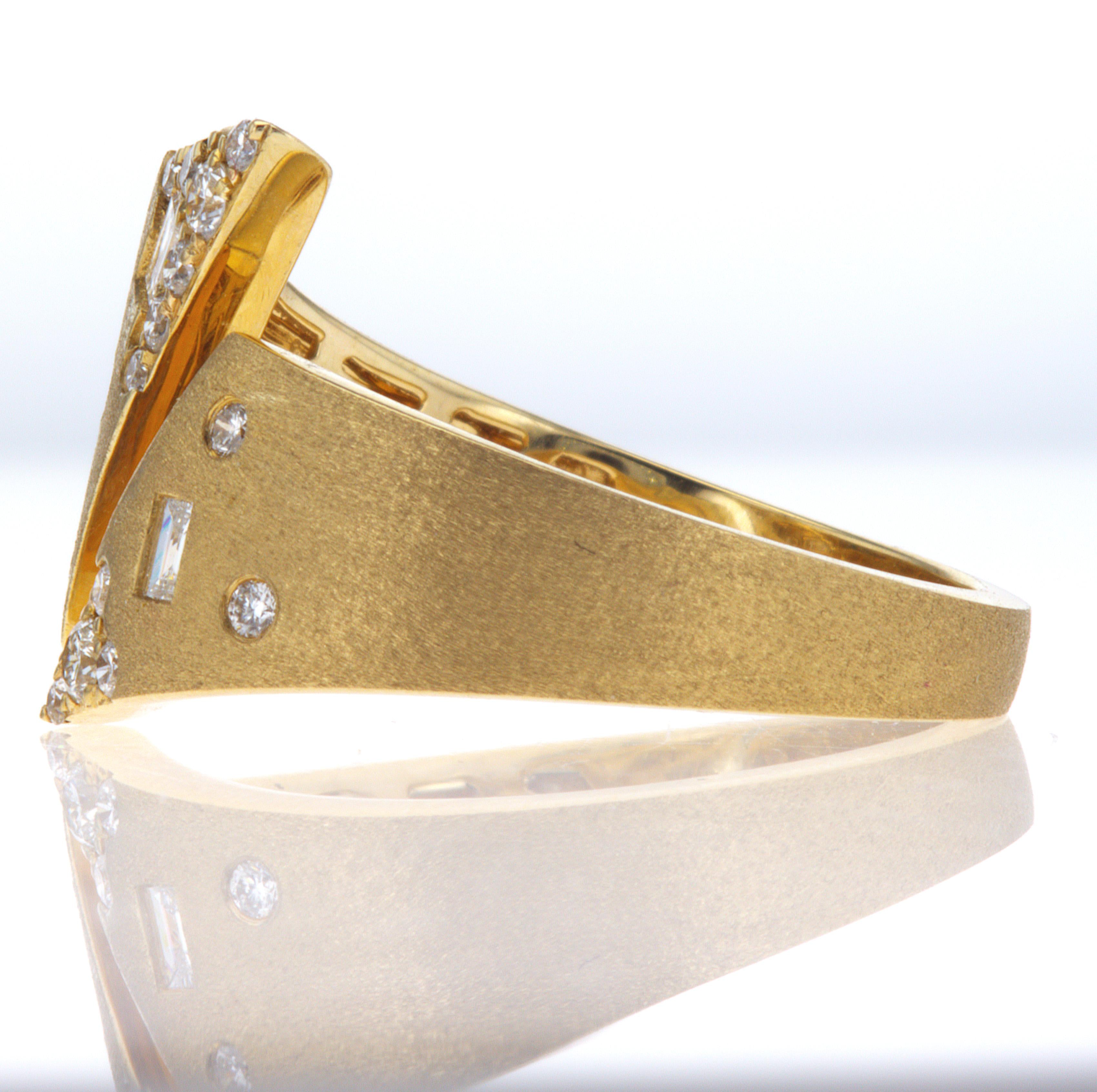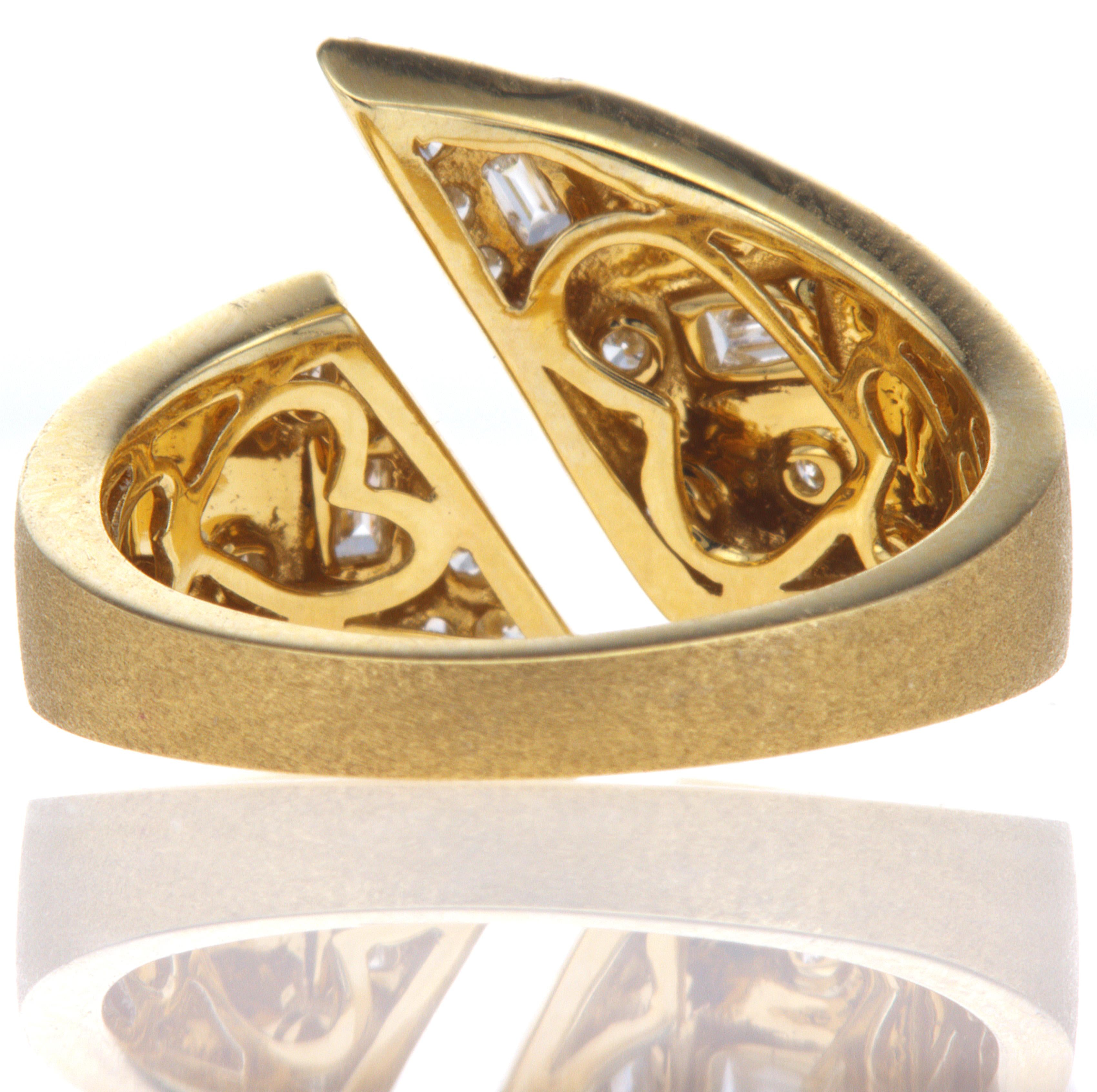 Flush-set baguette and round diamonds, totaling 0.31cts TW, scatter across the ring like sparkling fireworks, creating an unforgettable statement. Dare to shine! Size 6.5.