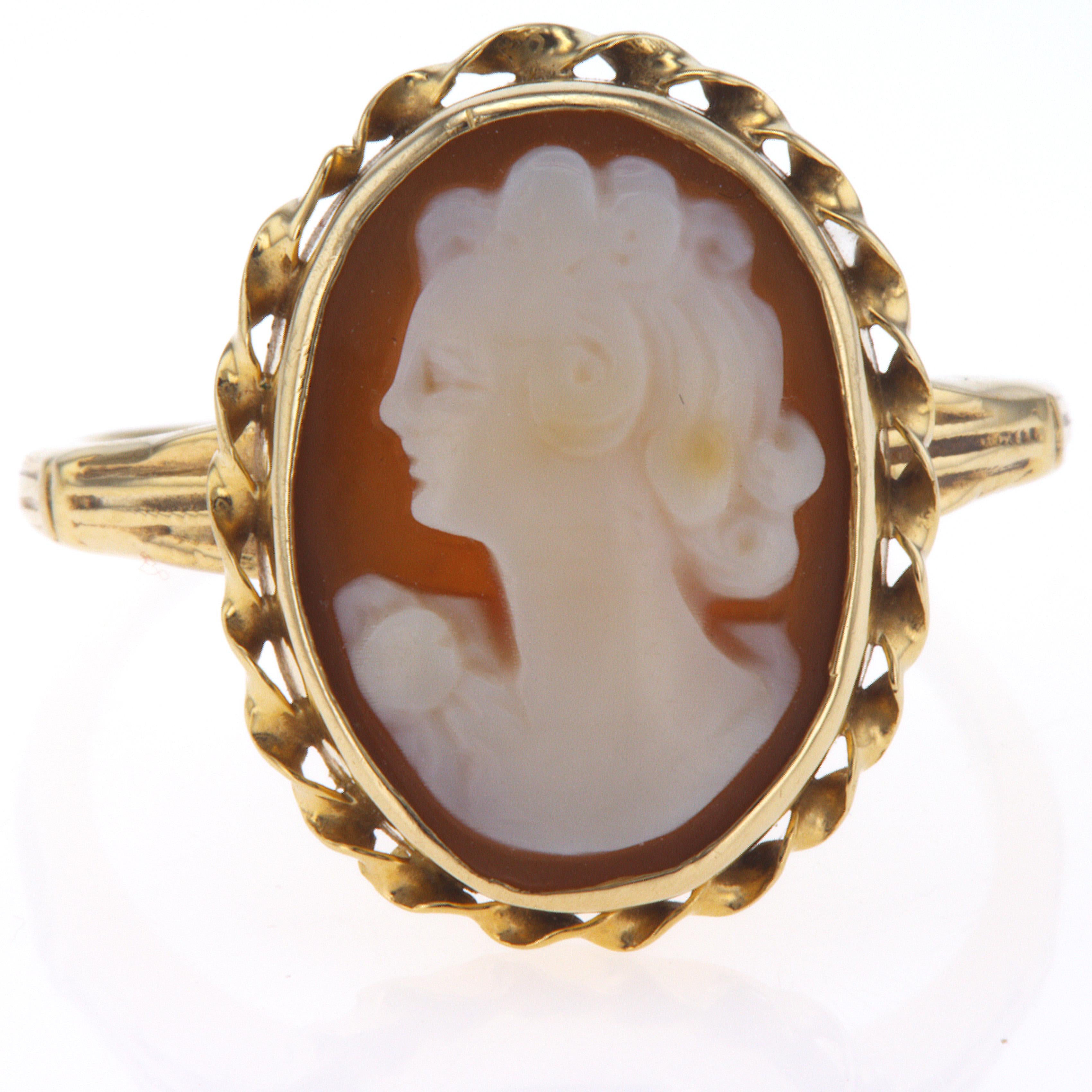 This exquisite ring features a 14KT yellow gold band, showcasing a captivating 12x16mm shell cameo. The cameo delicately depicts a female figure, making it a timeless and elegant piece.