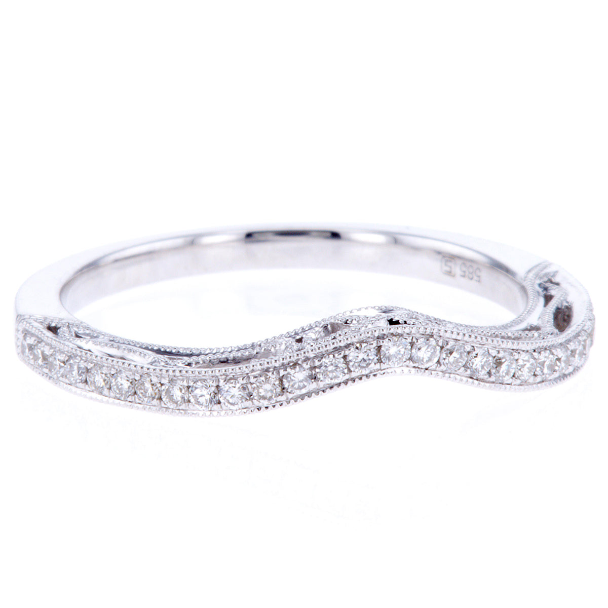 14Kt White Gold Milgrained With Open Filigree Sides Curved Diamond Band
